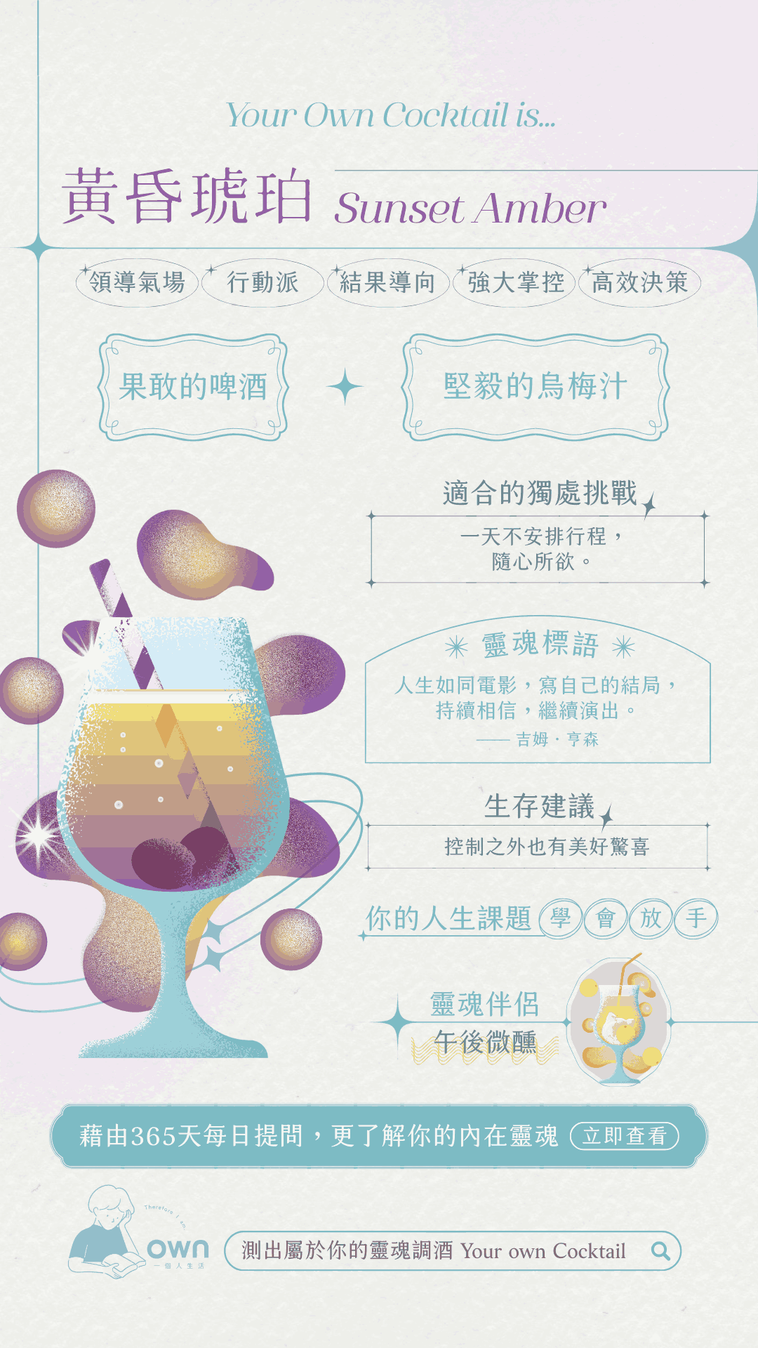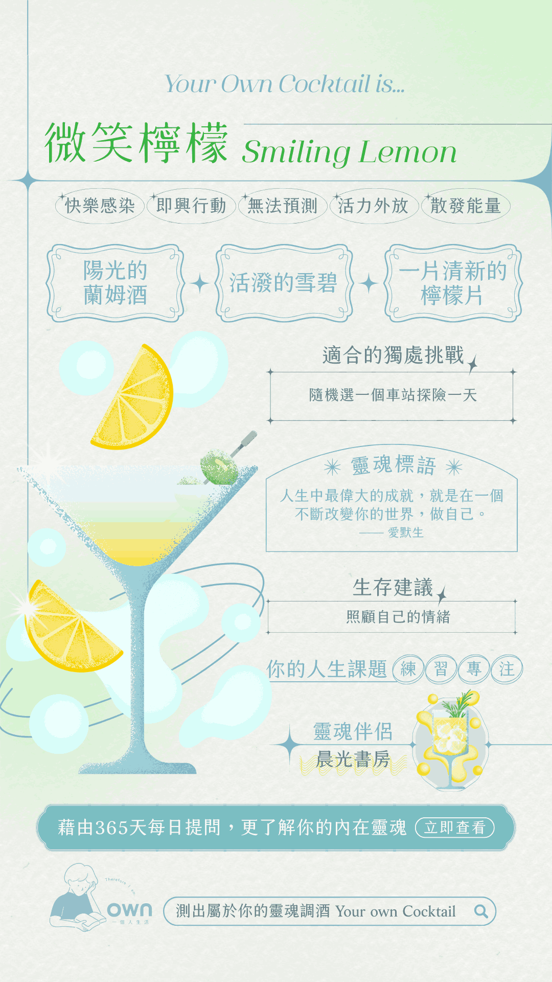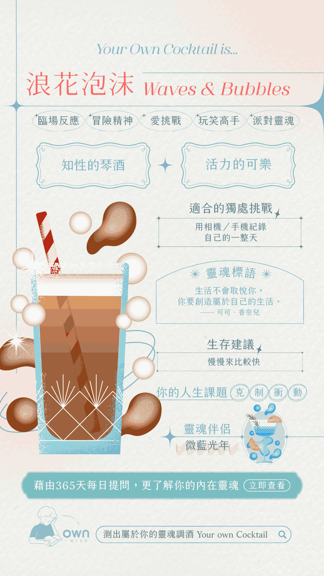 「靈魂調酒測驗|Your own Cocktail」已在社群上掀起討論熱潮,無數人好奇自己會是哪一杯專屬調酒。在這裡,你將透過一連串自我提問,調出一杯象徵內在氣質的靈魂調酒。