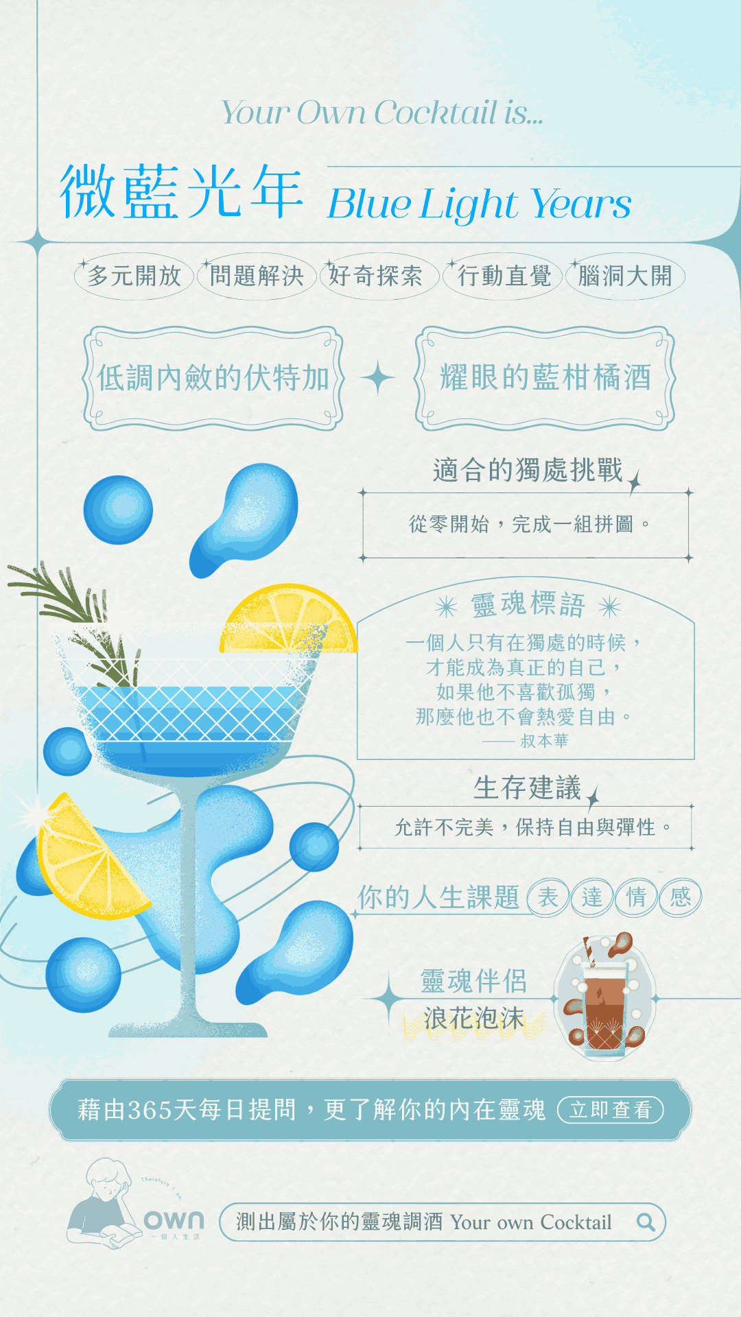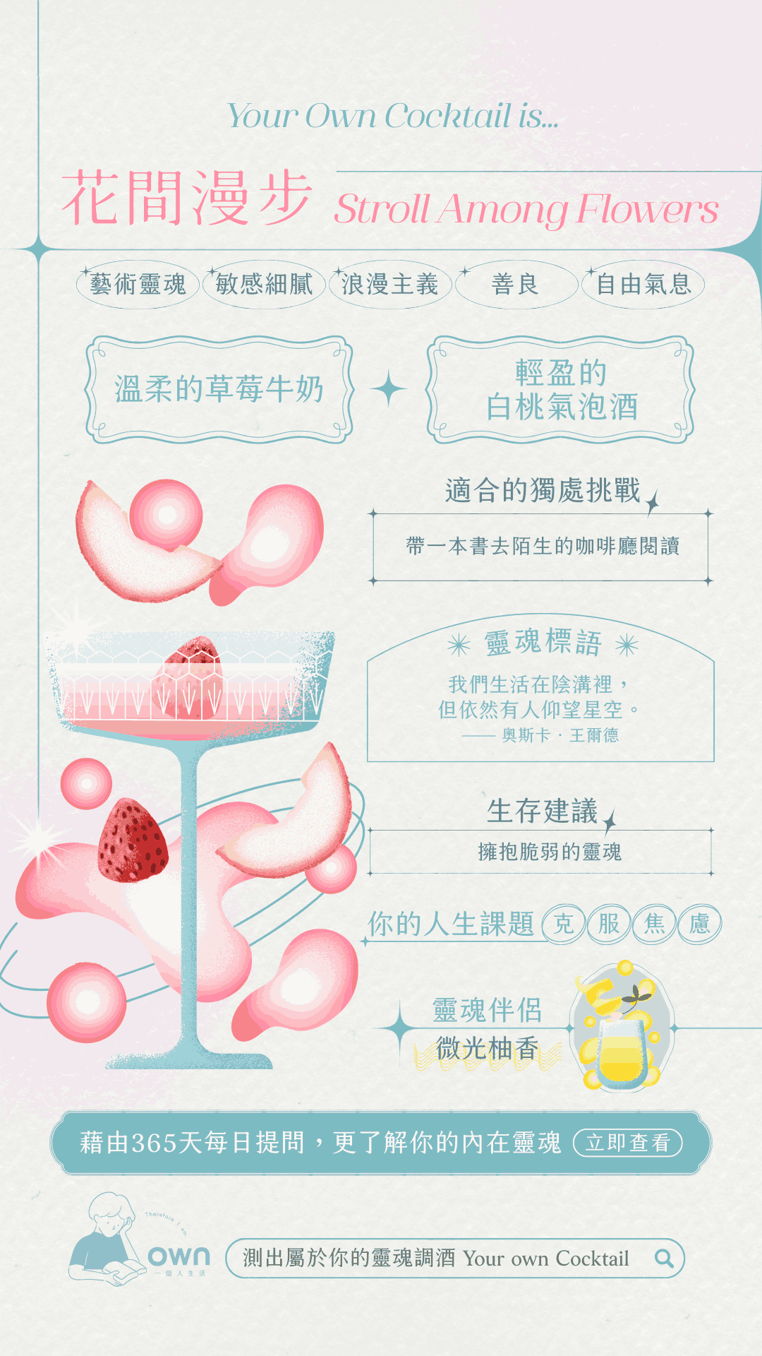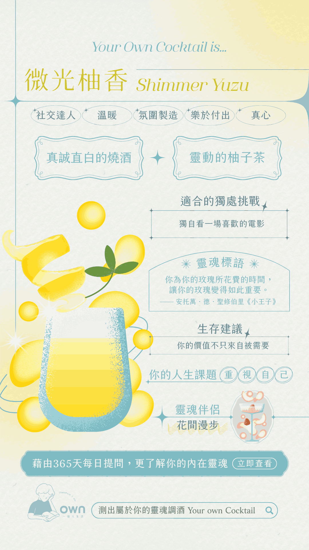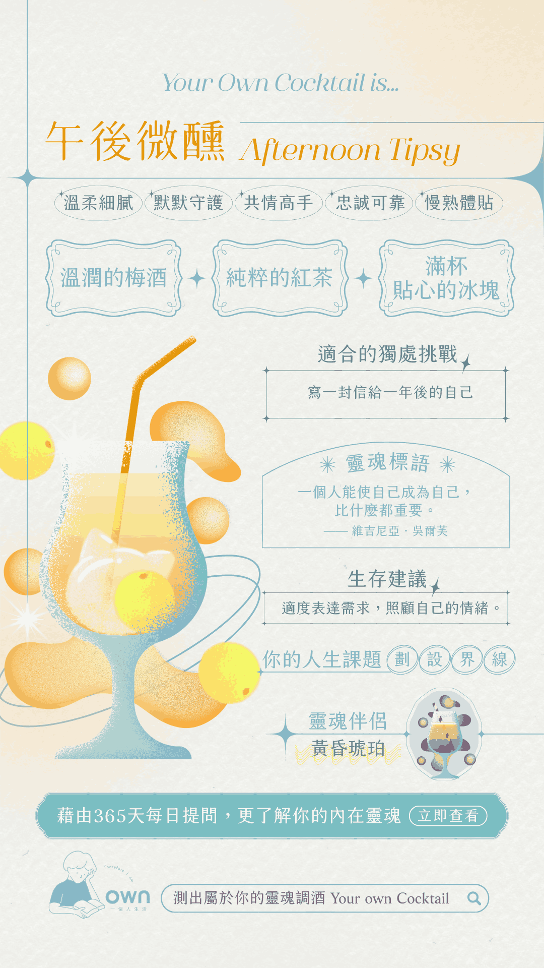 「靈魂調酒測驗|Your own Cocktail」已在社群上掀起討論熱潮,無數人好奇自己會是哪一杯專屬調酒。在這裡,你將透過一連串自我提問,調出一杯象徵內在氣質的靈魂調酒。