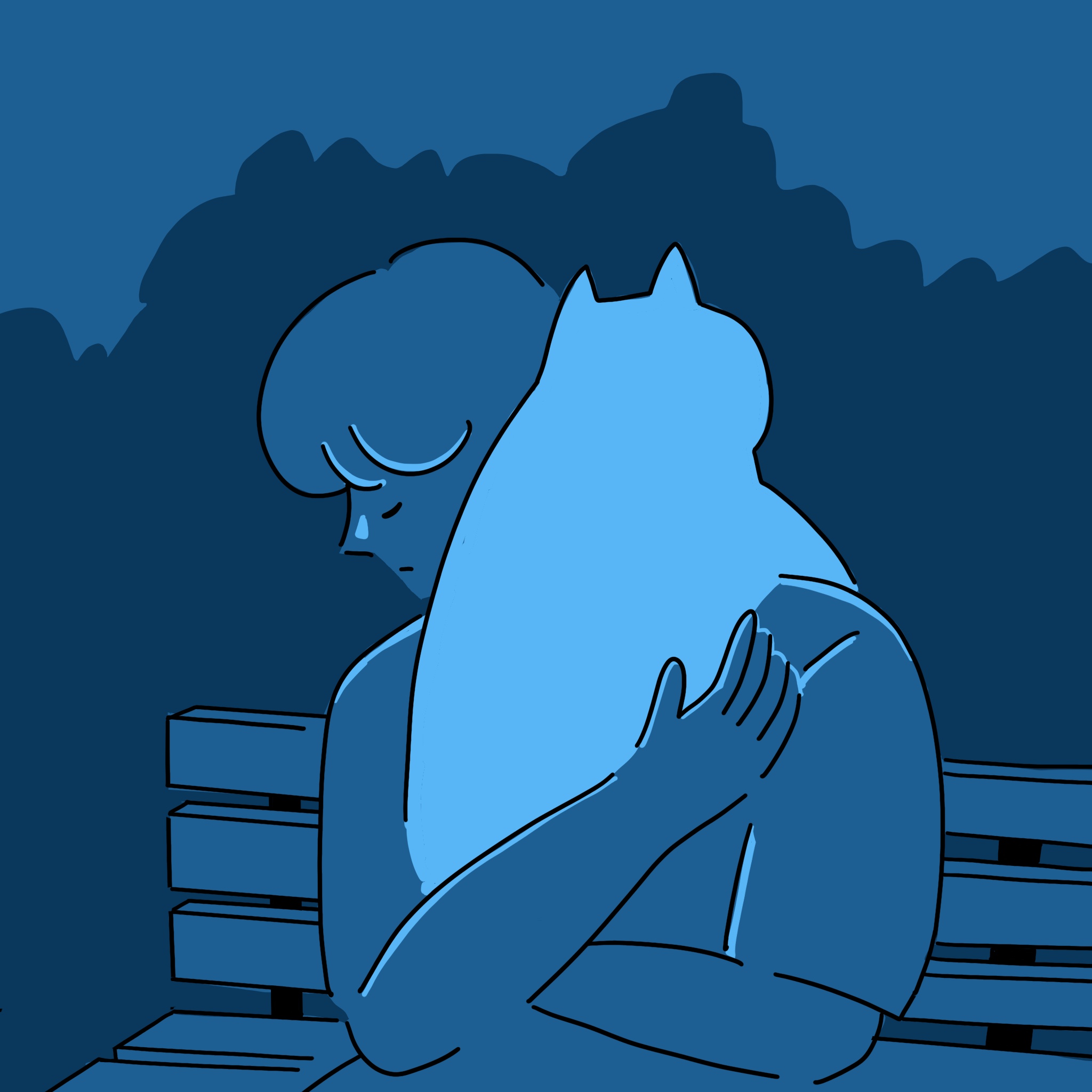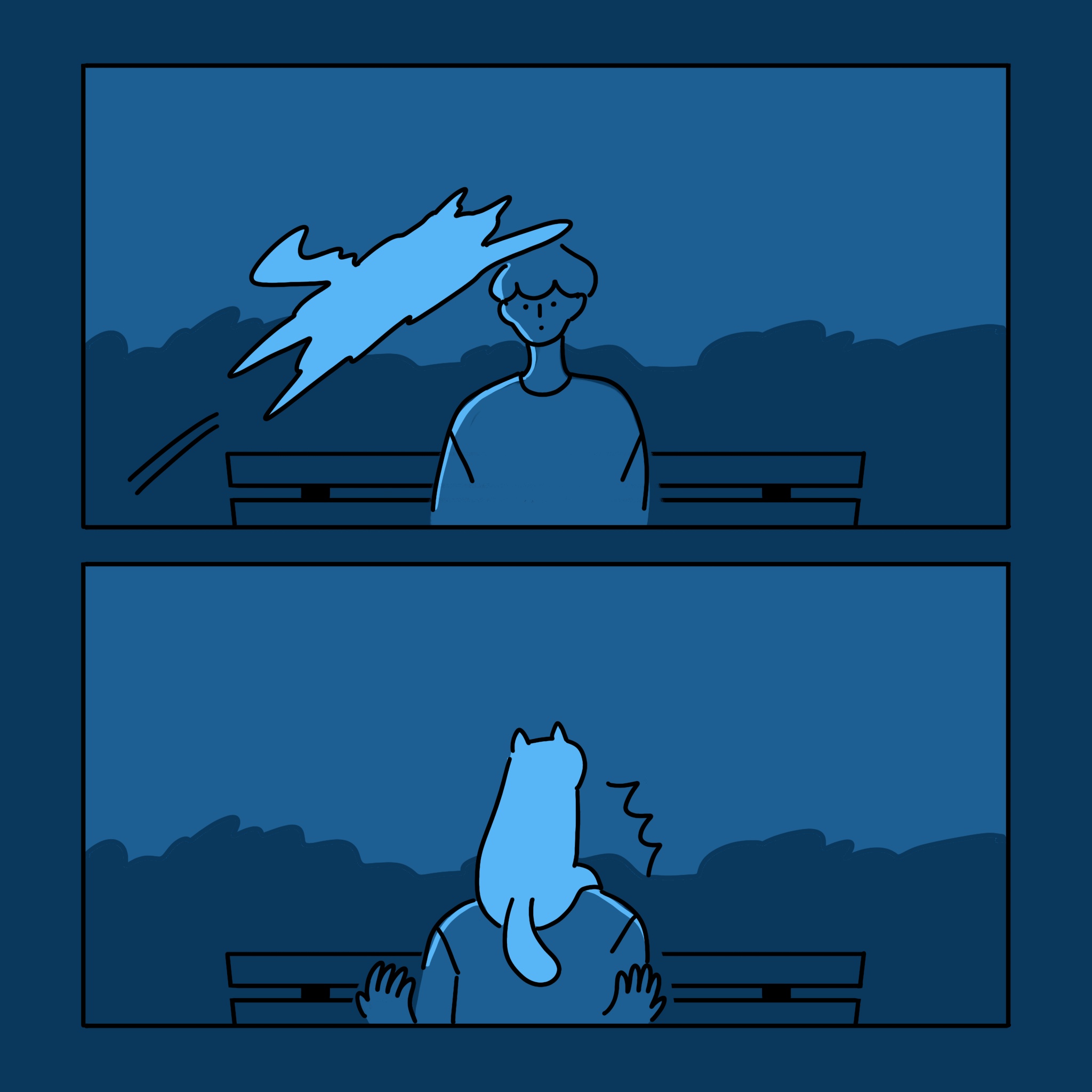 霎時間,黑暗籠罩了大地,小 own 不自覺想起自己的迷惘與不安,他對未來的想像還很模糊,而周圍的朋友都漸漸有了目標,並努力地朝著夢想邁進,他們的身影看起來是如此的閃閃發光,想到這裡,他的神色不自覺的黯淡下來。