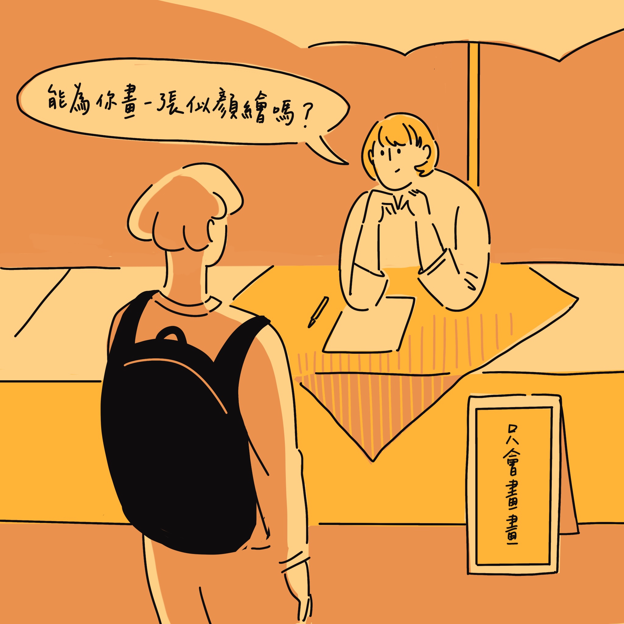 「你好,我能為你畫一張似顏繪嗎?」一位無印風穿著的女孩對小own 說,女孩面前放了一個寫有「只會畫畫」的立牌。