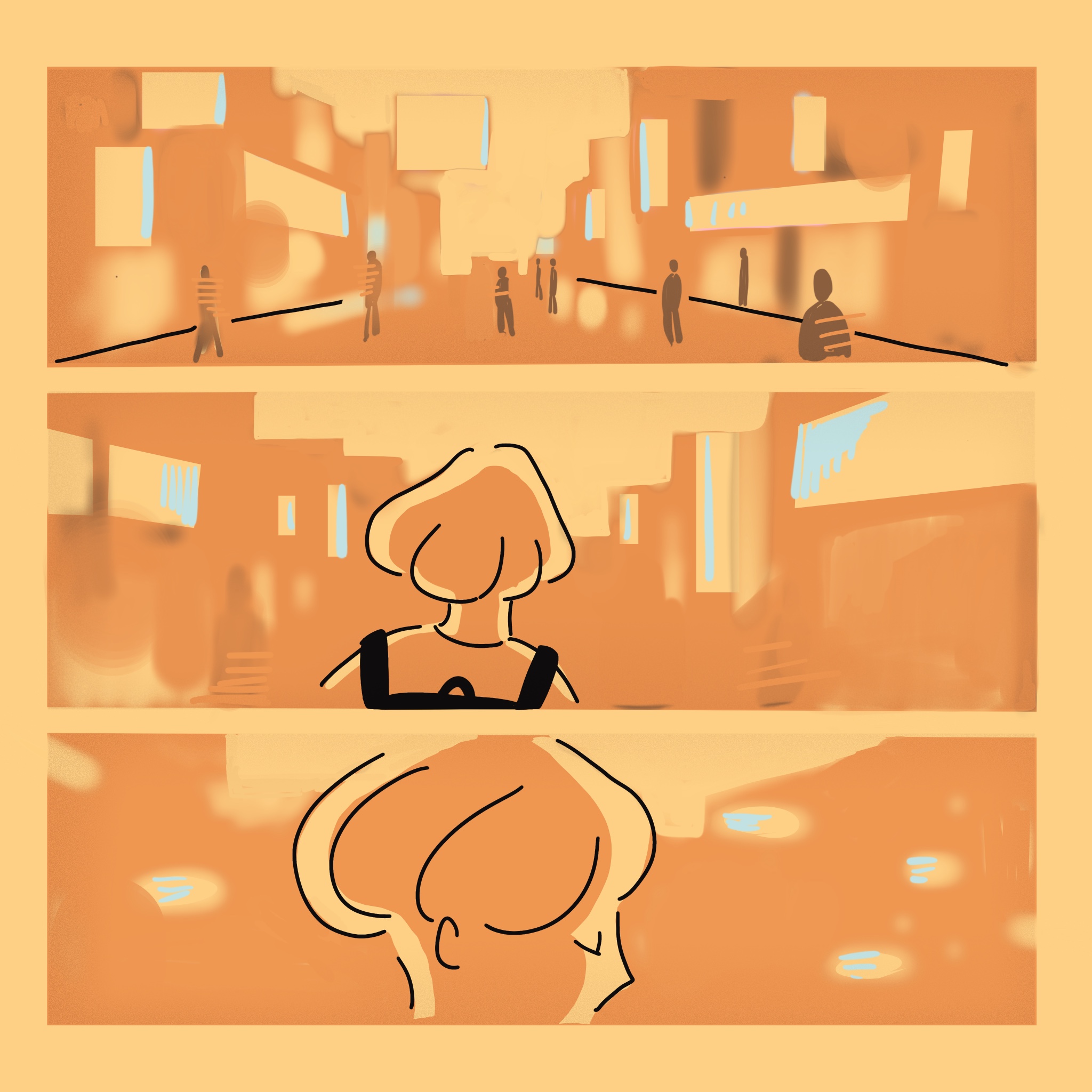 城市的街頭很熱鬧,明黃的浪漫燈光、來往穿著時尚的男女、玻璃櫥窗的精美商品、機車汽車公車的引擎聲、街頭藝人的賣力演出等等,和小own 擦肩而過的這些喧嘩,與他形成強烈的對比,因為這樣,他彷彿隱身在這座城市中,意外地充滿獨處的安全感。