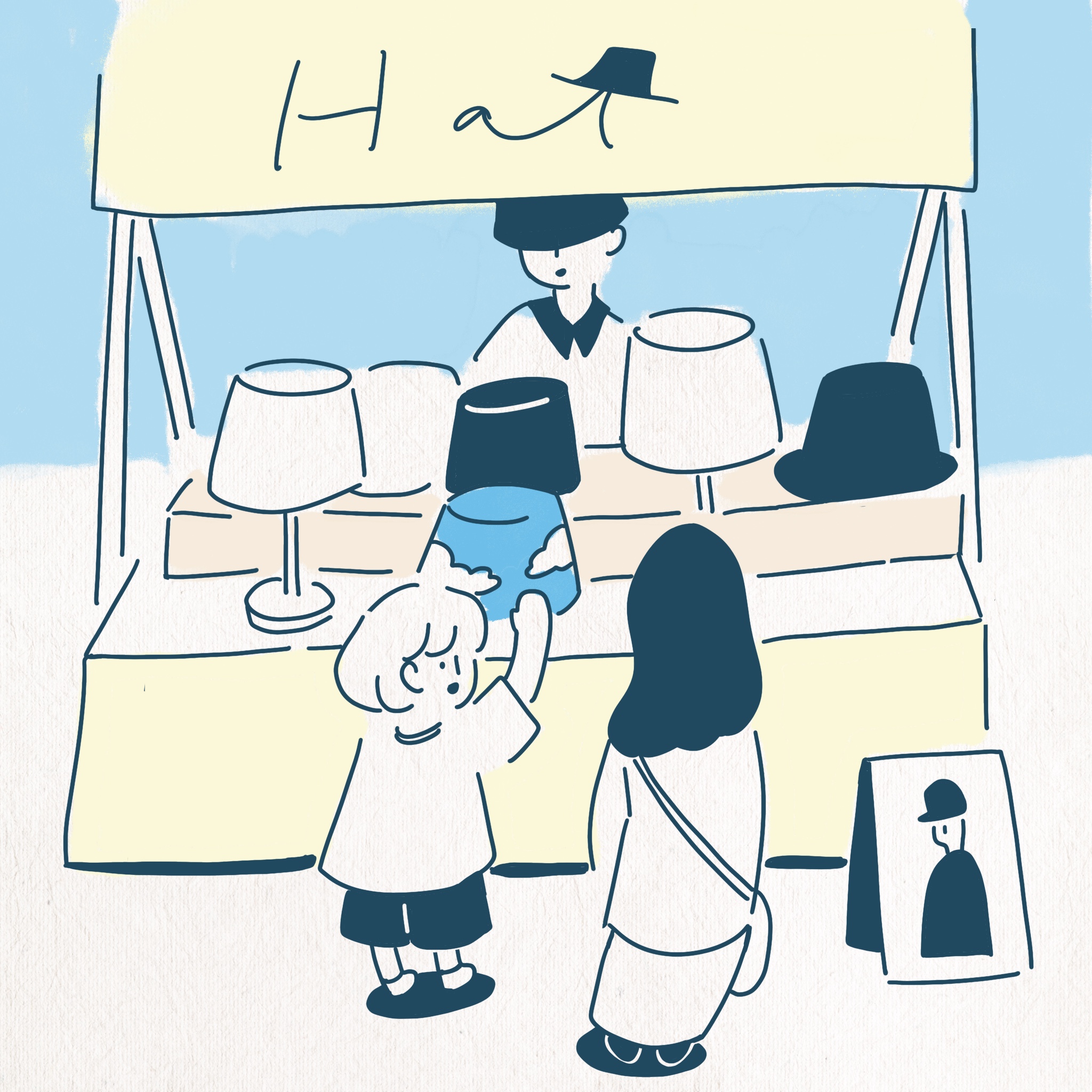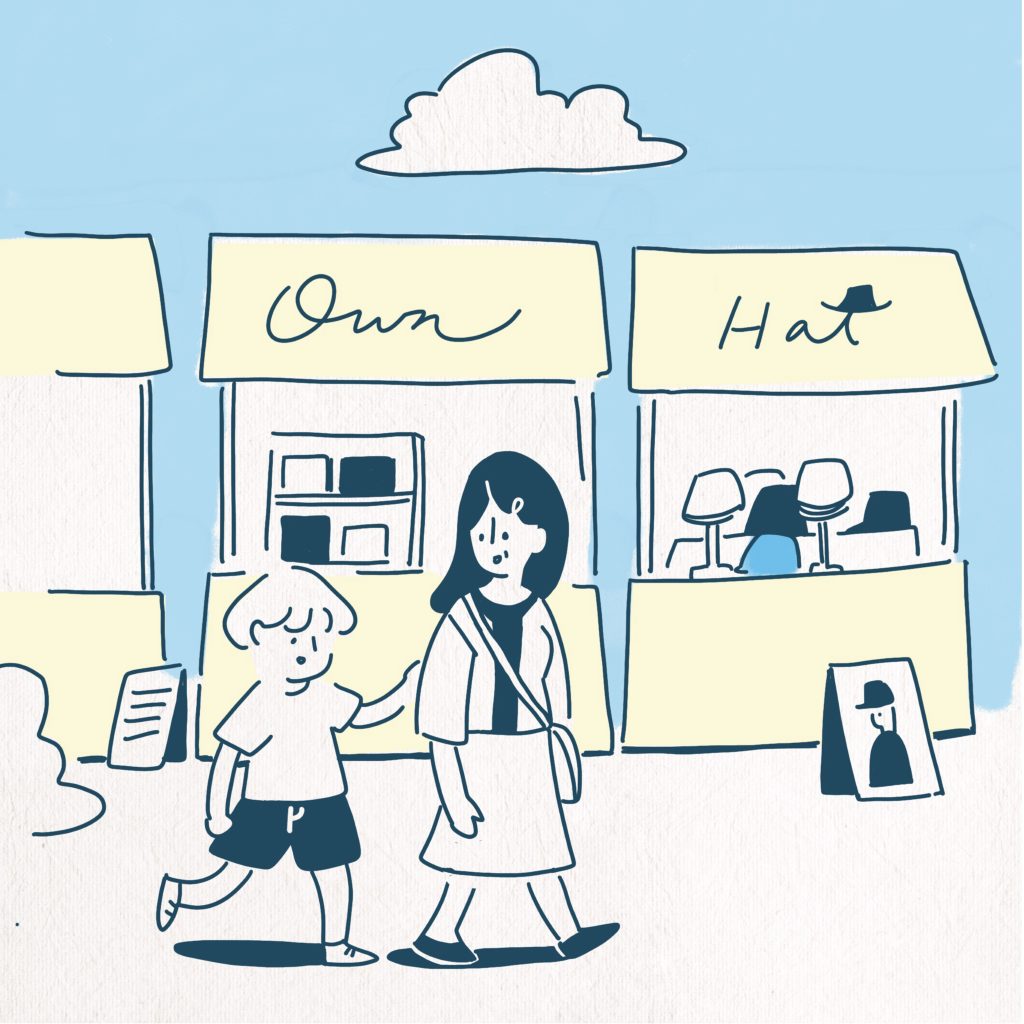 當時還在念國小的小 own,有著對看到的事物,喜歡就要擁有的堅持。「媽媽,我喜歡這個。」「小 own,我們來練習帶回喜歡又需要的東西就好。」小 own 媽溫柔地對小 own 說道。最後他們停留在在販售帽子的攤位前。小 own 一眼就看見那頂藍的恰到好處的漁夫帽。