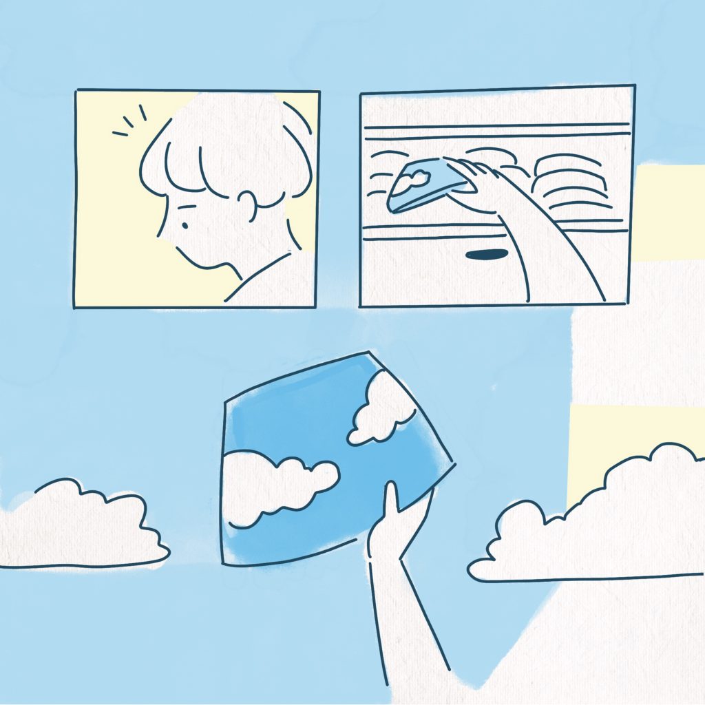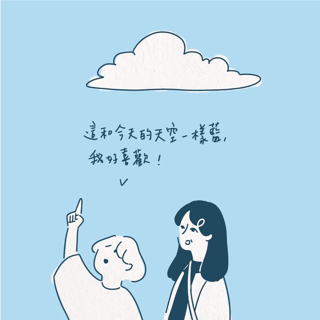 手指輕撫過帽子表面,是頂有毛絨雲朵圖案的漁夫帽。小 own 驚喜又困惑的將它帶出衣櫥。阿,天藍色的帽底,讓小 own 自然地回想起:和媽媽一起在市集悠晃著、將雲朵漁夫帽帶回家的那日,天也是這樣的藍。